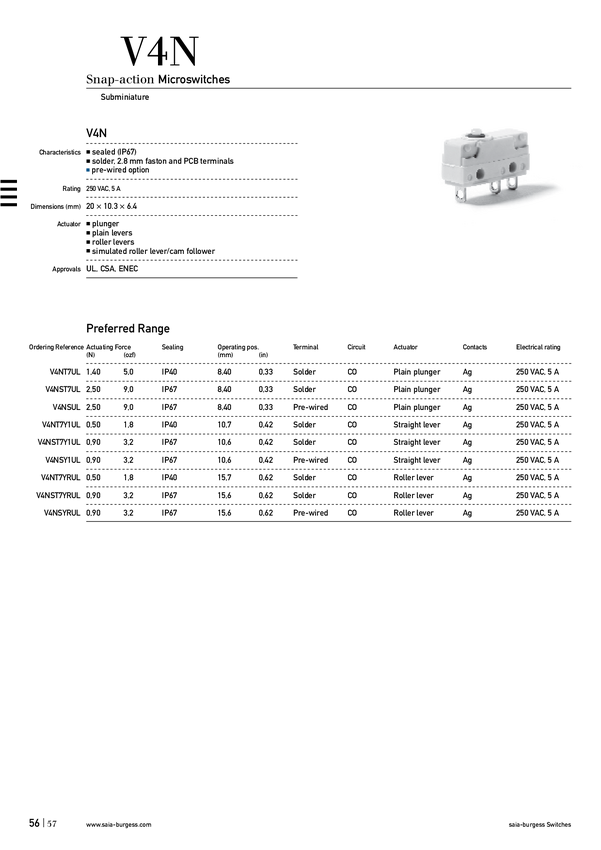 Mikroprzełącznik; V4NST7UL; bez dźwigni; SPDT; 5A/250V AC; ON-(ON); IP67; SAIA-BURGESS; = SR0-00A; RoHS