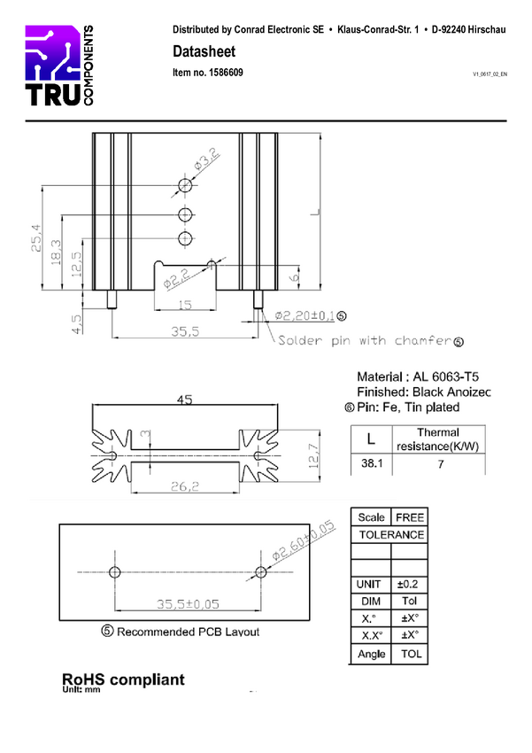 TRU COMPONENTS 1586609 TC-V7466X-203 Radiator żeberkowy 7 K/W (D x S x W) 38.1 x 45 x 11.94 mm TO-220, TOP-3, SOT-32