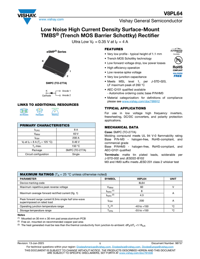 Low Noise High Current Density Surface-Mount TMBS® (Trench MOS Barrier Schottky) Rectifier Ultra Low VF = 0.35 V at IF = 4 A
