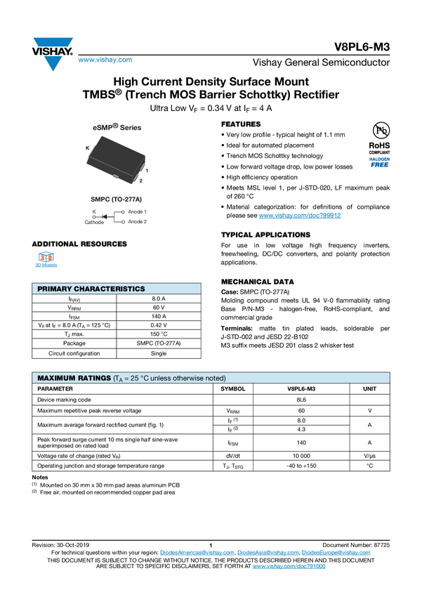 High Current Density Surface-Mount TMBS® (Trench MOS Barrier Schottky) Rectifier Ultra Low VF = 0.36 V at IF = 4 A