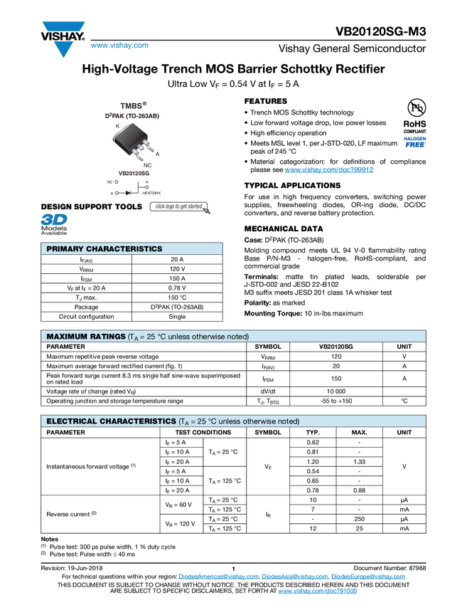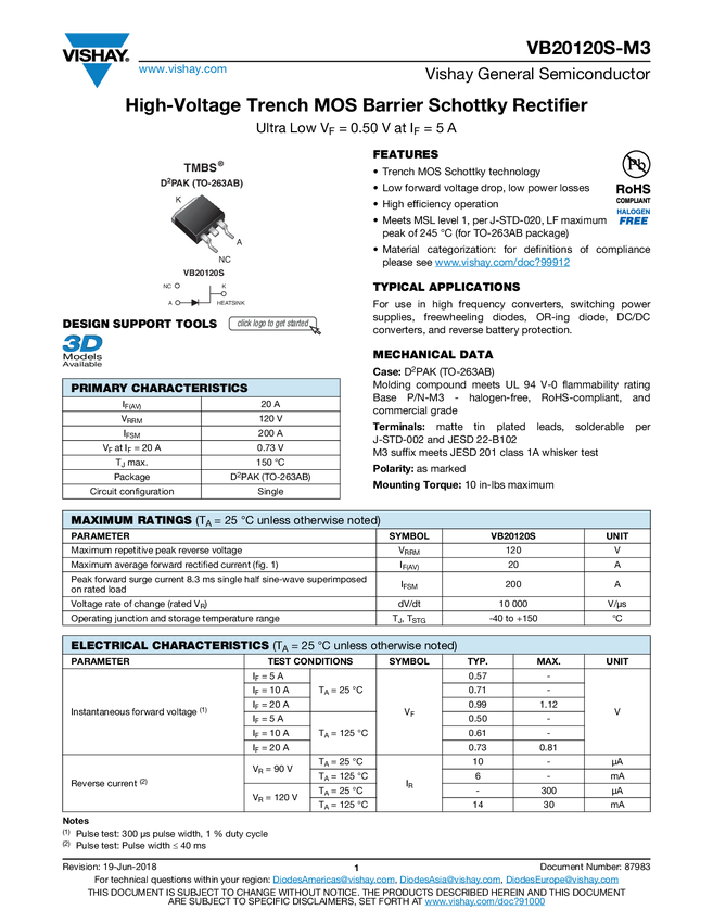 High Voltage TMBS® (Trench MOS Barrier Schottky) Rectifier Ultra Low VF = 0.446 V at IF = 5 A
