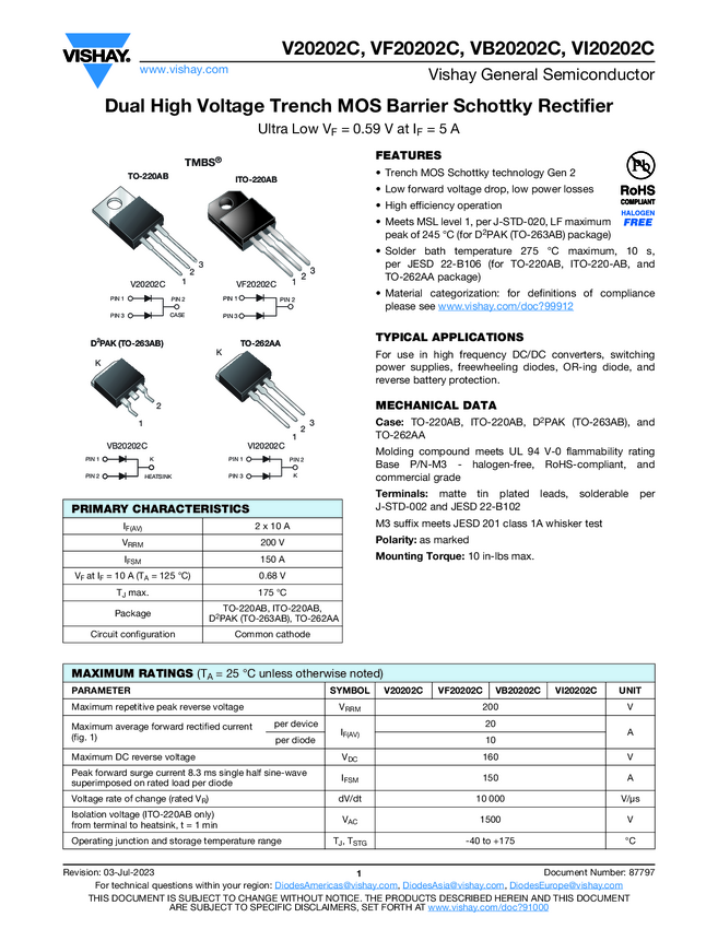 Dual High Voltage TMBS® (Trench MOS Barrier Schottky) Rectifier Ultra Low VF = 0.59 V at IF = 5 A