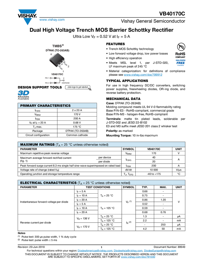 Dual High Voltage Trench MOS Barrier Schottky Rectifier Ultra Low VF = 0.52 V at IF = 5 A