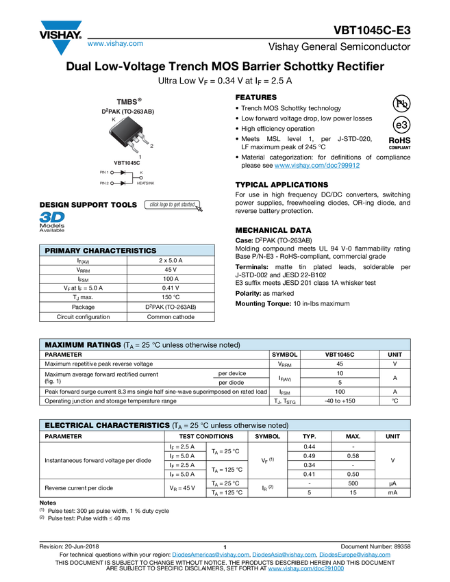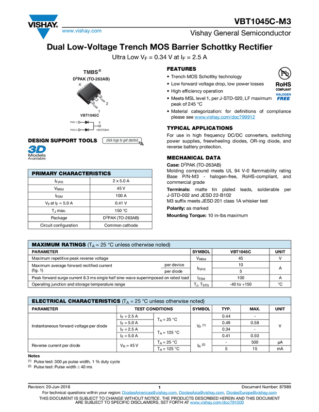 Trench MOS Barrier Schottky Rectifier for PV Solar Cell Bypass Protection Ultra Low VF = 0.34 V at IF = 2.5 A