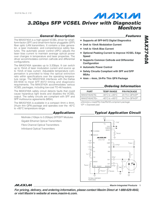 MAX3740A 3.2Gbps SFP VCSEL Driver with Diagnostic Monitors