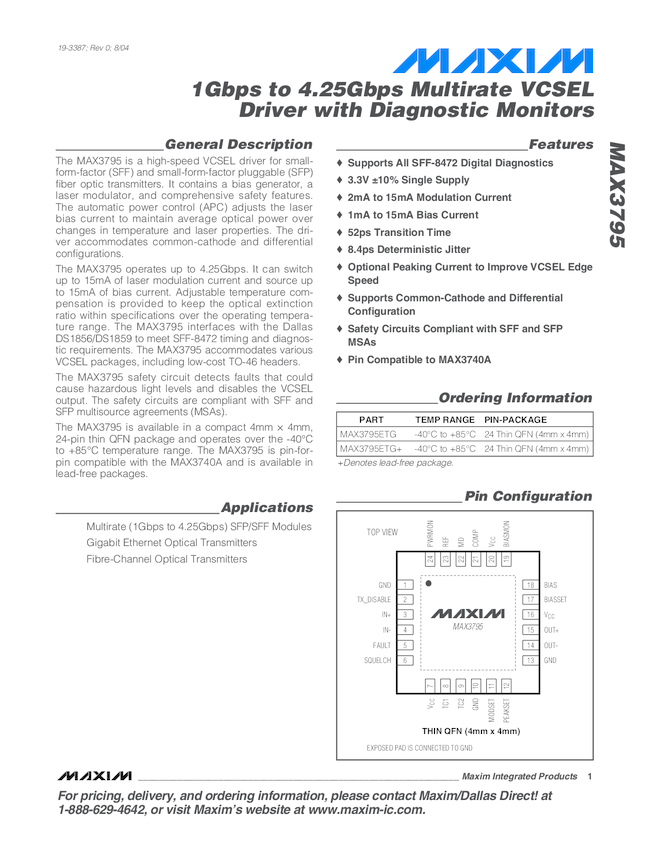 MAX3795 1Gbps to 4.25Gbps Multirate VCSEL Driver with Diagnostic Monitors