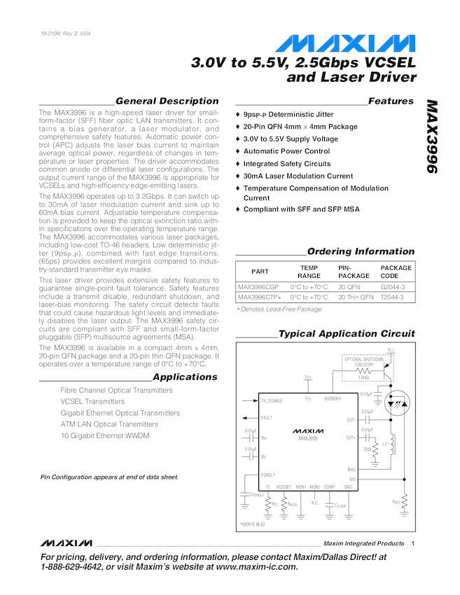 MAX3996 +3.0V to +5.5V, 2.5Gbps VCSEL and Laser Driver
