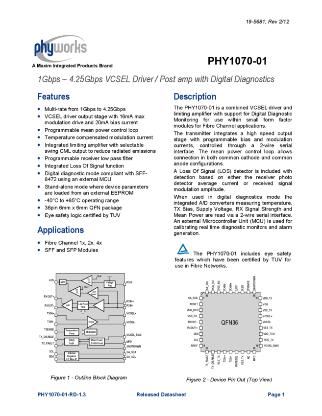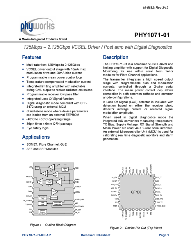 PHY1071 125Mbps to 2.125Gbps VCSEL Driver/Postamp with Digital Diagnostics