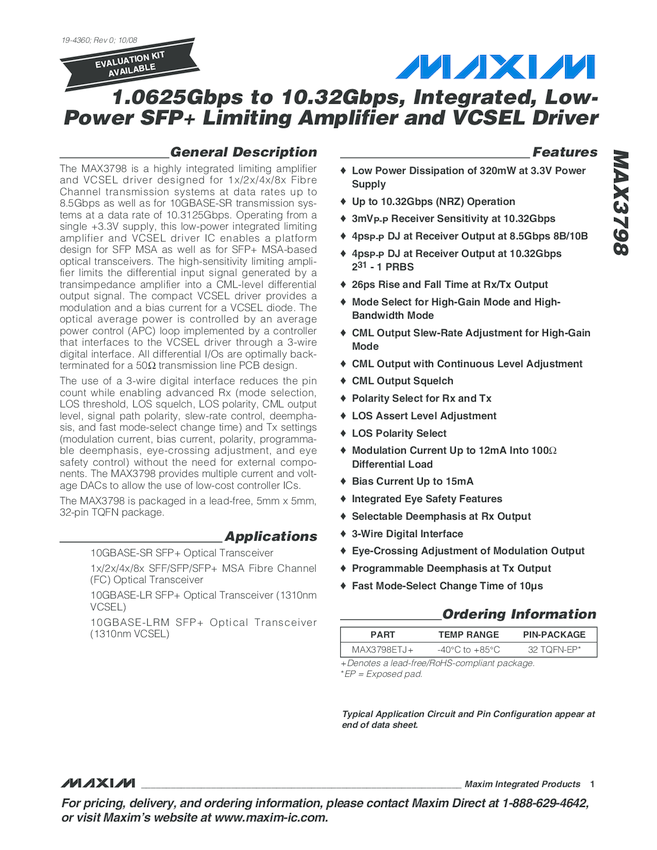 MAX3798 1.0625Gbps to 10.32Gbps SFP+ Limiting Amplifier and VCSEL Driver