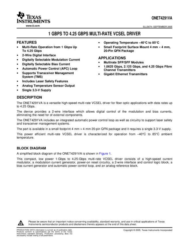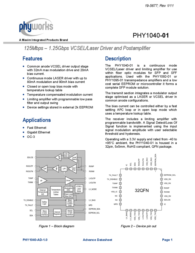 PHY1040 125Mbps to 1.25Gbps VCSEL/Laser Driver and Postamplifier