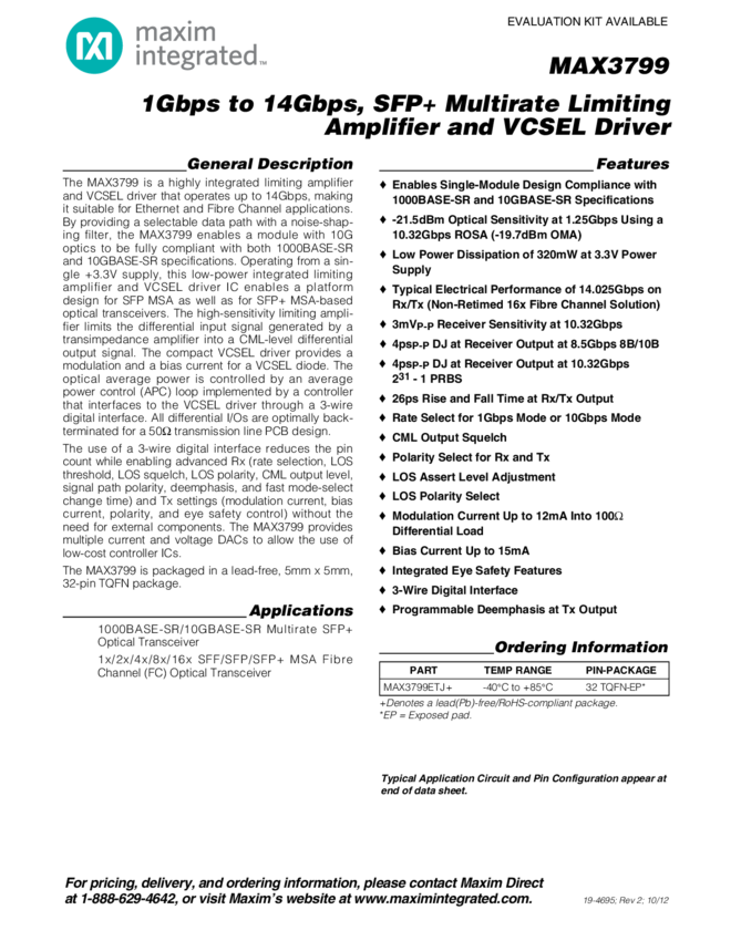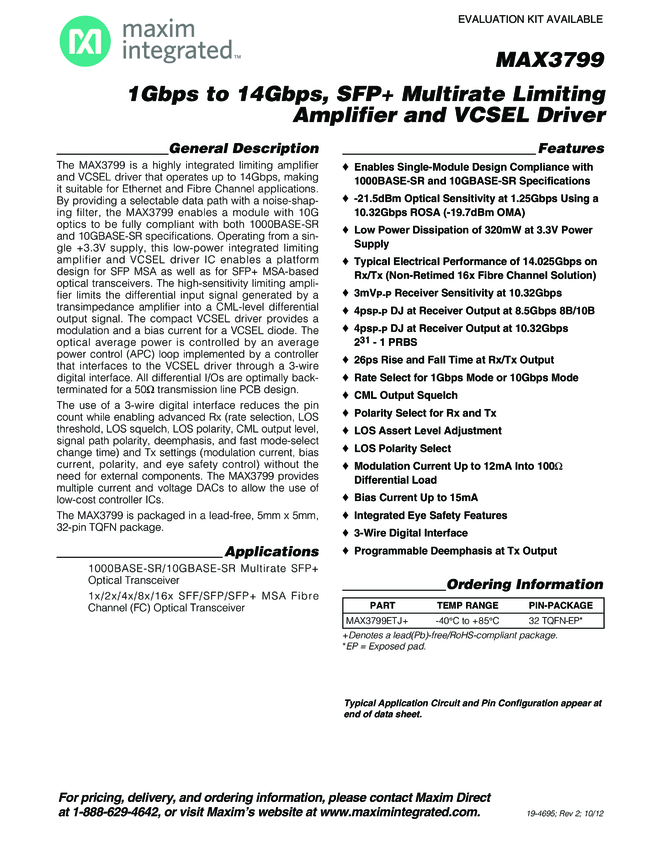 MAX3799 1Gbps to 14Gbps, SFP+ Multirate Limiting Amplifier and VCSEL Driver