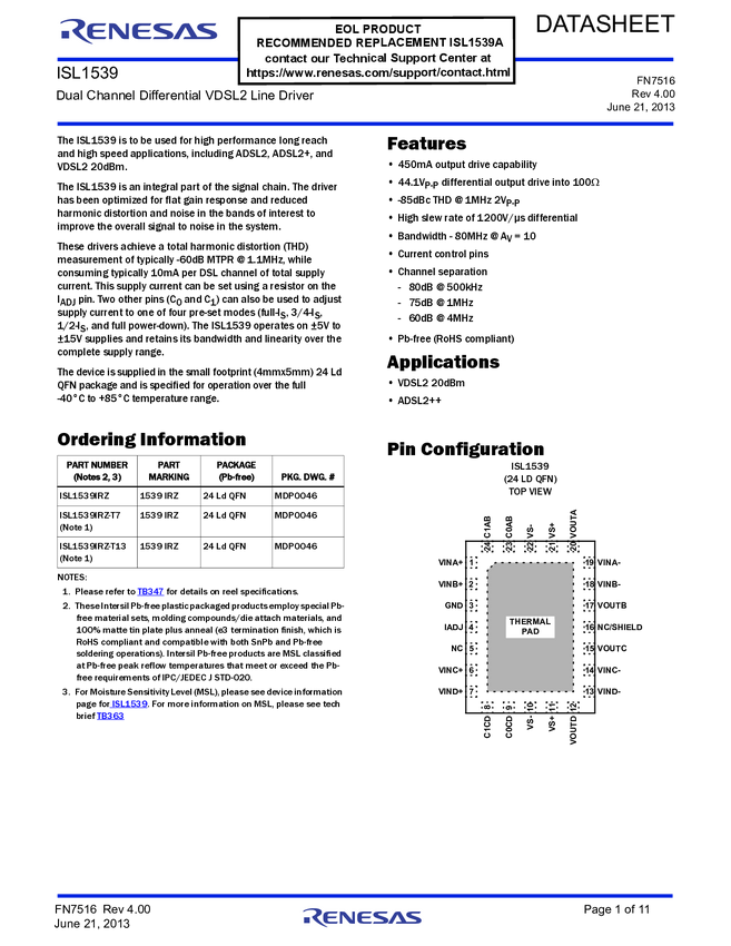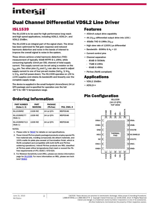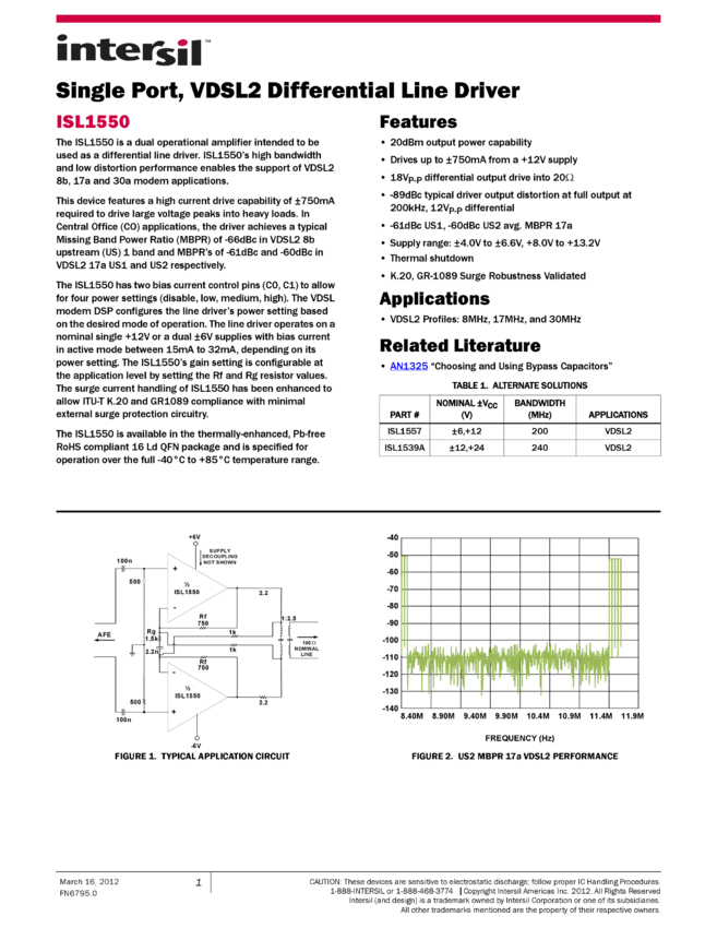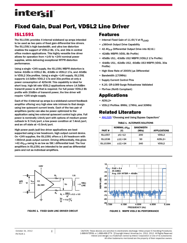 Fixed Gain, Dual Port, VDSL2 Line Driver