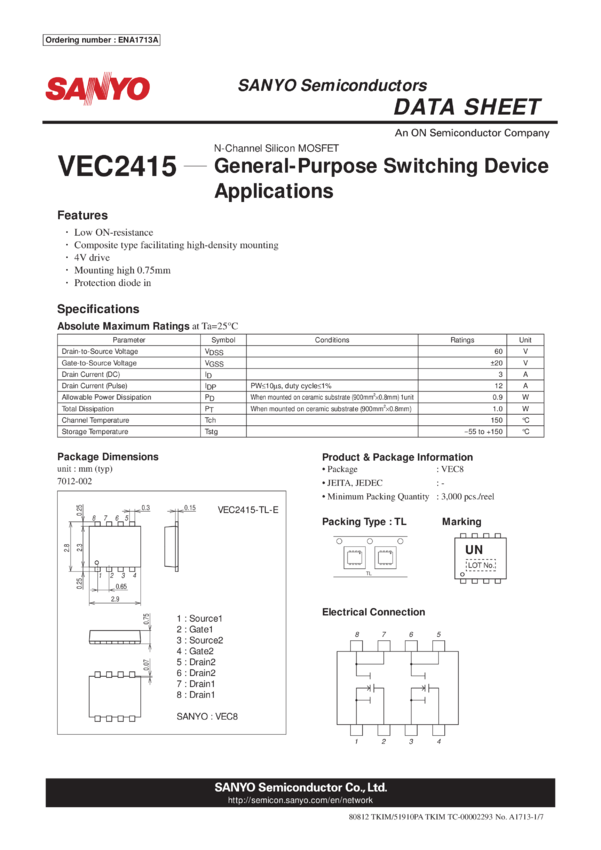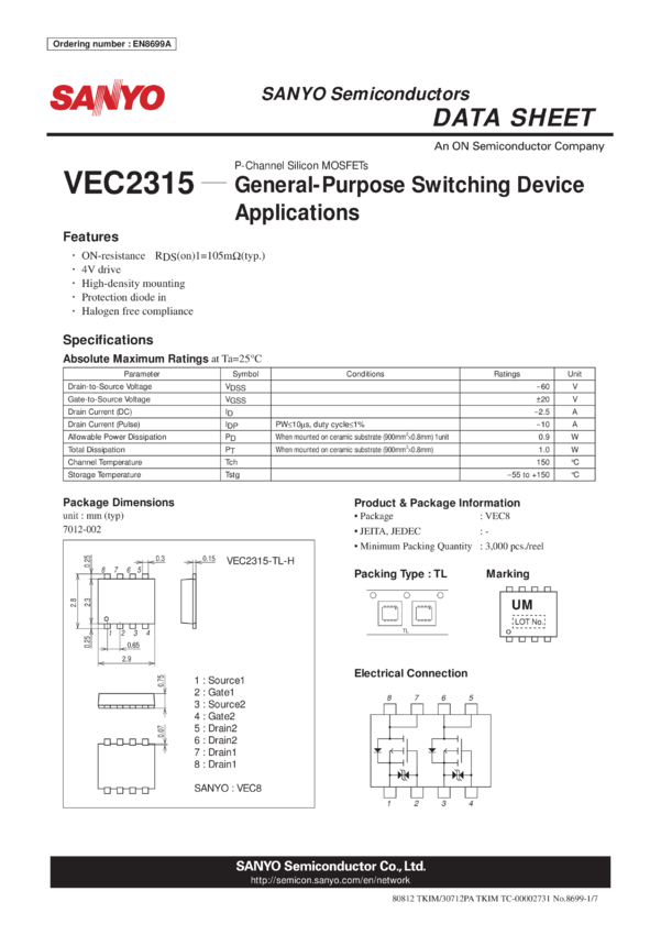 Small Signal MOSFET 60V 3A 80 mOhm Dual N-Channel VEC8