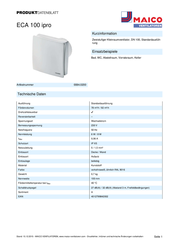 Wentylator ścienny i sufitowy Maico Ventilatoren ECA 100 ipro 230 V 92 m³/h 10 cm
