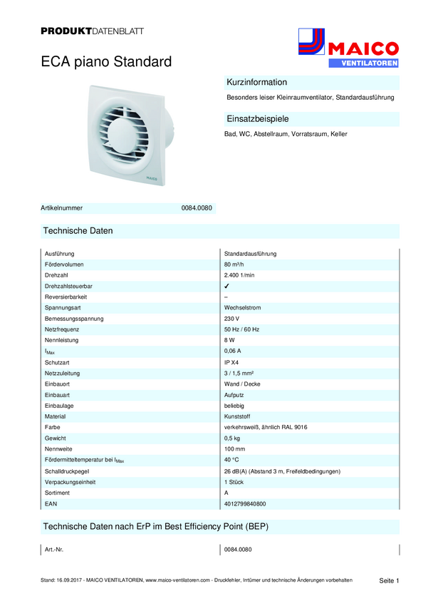 Wentylator ścienny i sufitowy Maico Ventilatoren ECA piano Standard 230 V 80 m³/h 10 cm