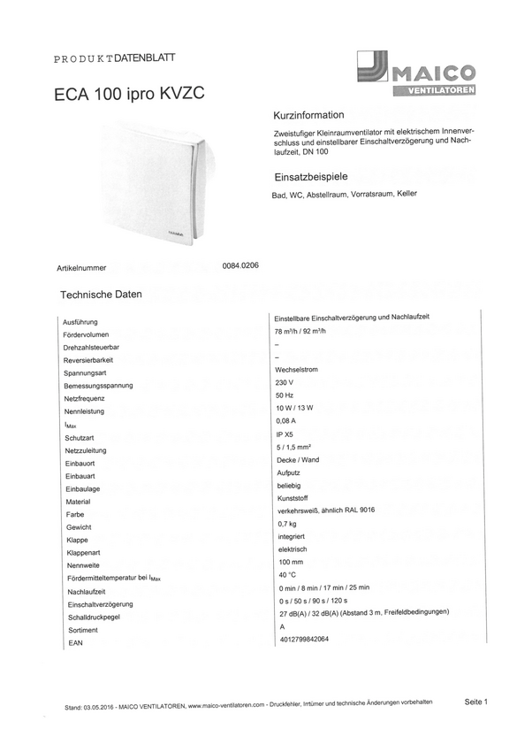 Maico Ventilatoren ECA 100 ipro KVZC Wentylator ścienny i sufitowy 230 V 92 m³/h 10 cm