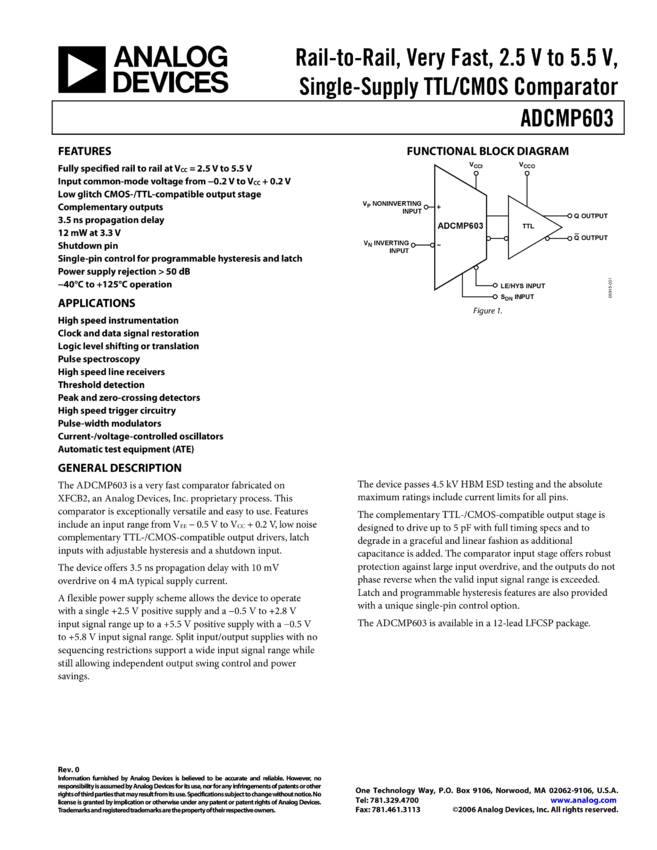 ADCMP602: Rail-to-Rail, Very Fast, 2.5 V to 5.5 V, Single-Supply TTL/CMOS Comparator in 8-lead MSOP and LSCFP Packages