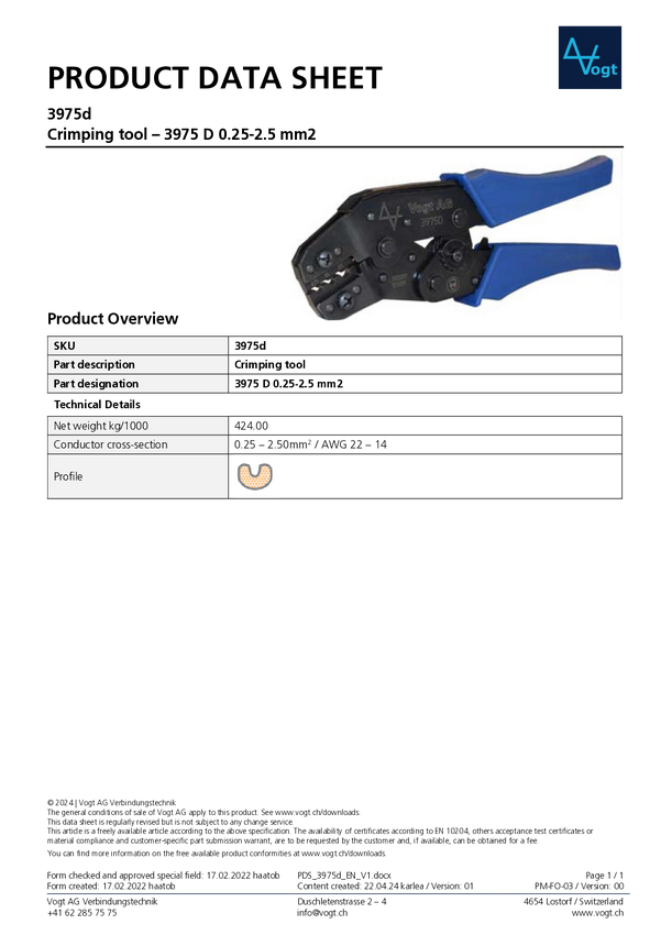 Zaciskarka Vogt Verbindungstechnik 3975 D 0.25-2.5 mm2 3975d, 0.25 do 2.50 mm²