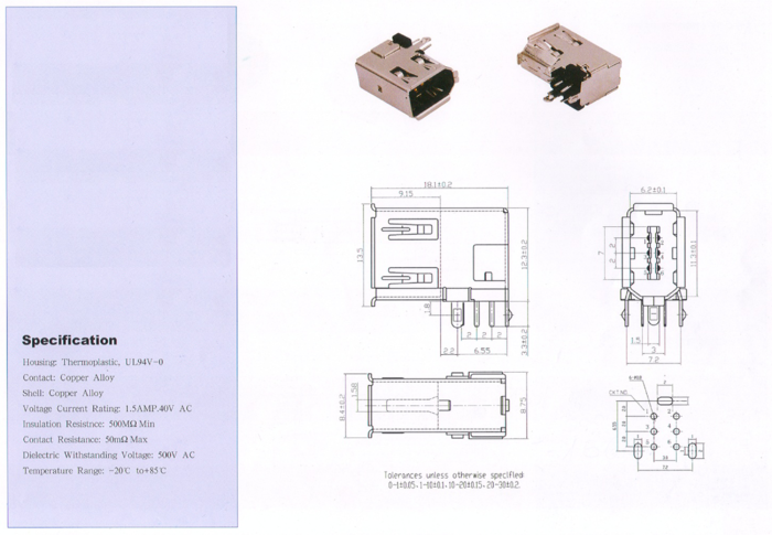 Gniazdo IEEE 1394/6, 6-stykowe, kątowe "vertical", do montażu przewlekanego