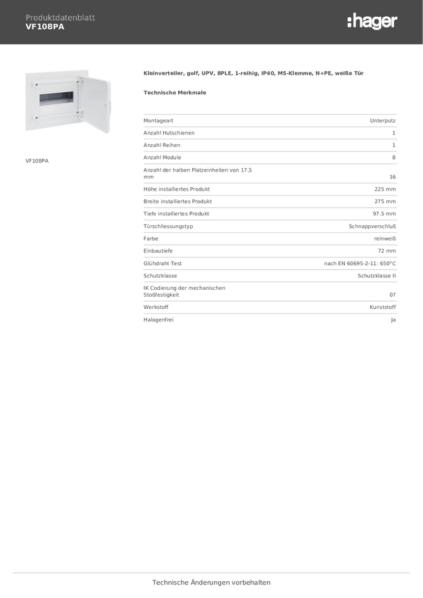 Hager VF108PA Rozdzielnica mała podtynkowy Ilość rzędów = 1 Content 1 szt.