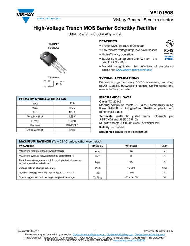 High-Voltage Trench MOS Barrier Schottky Rectifier Ultra Low VF = 0.59 V at IF = 5 A