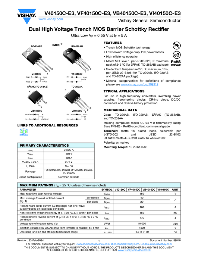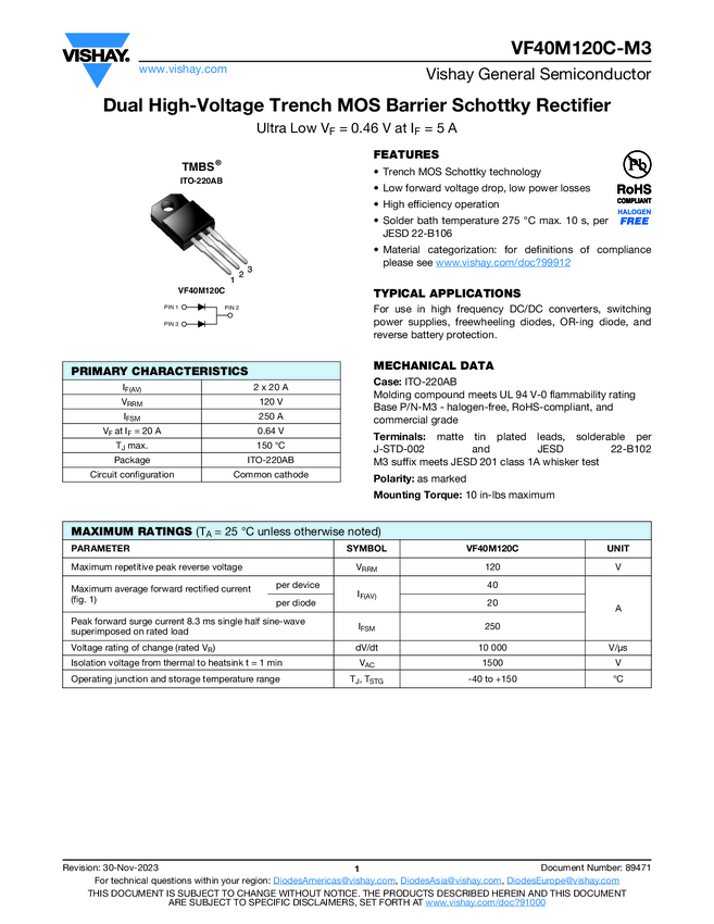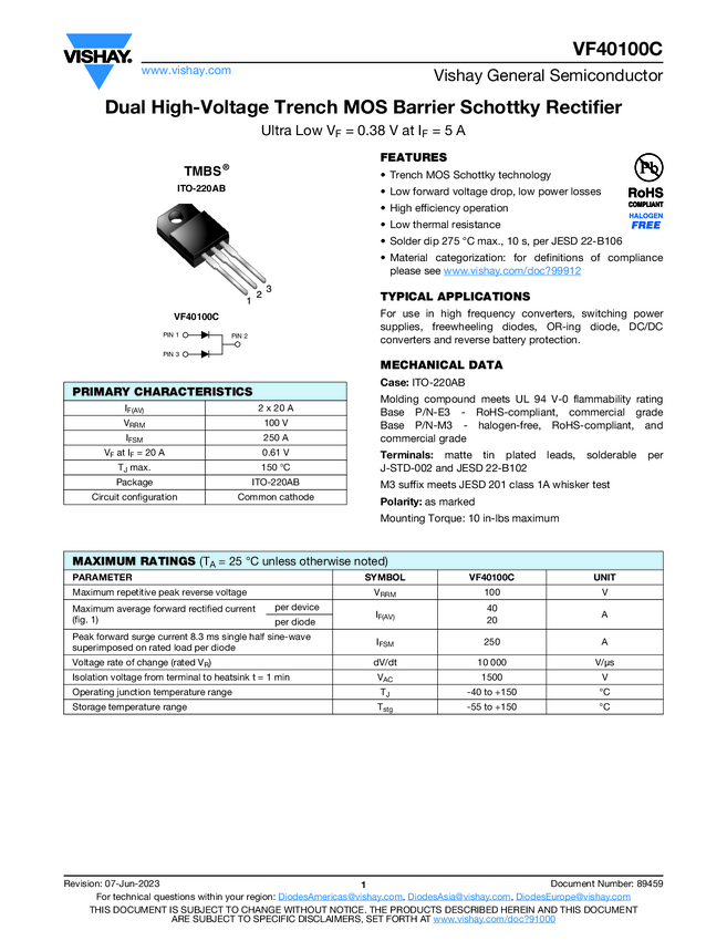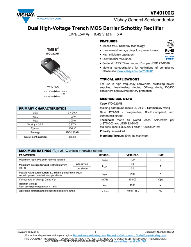 Dual High Voltage Trench MOS Barrier Schottky Rectifier Ultra Low VF = 0.42 V at IF = 5 A