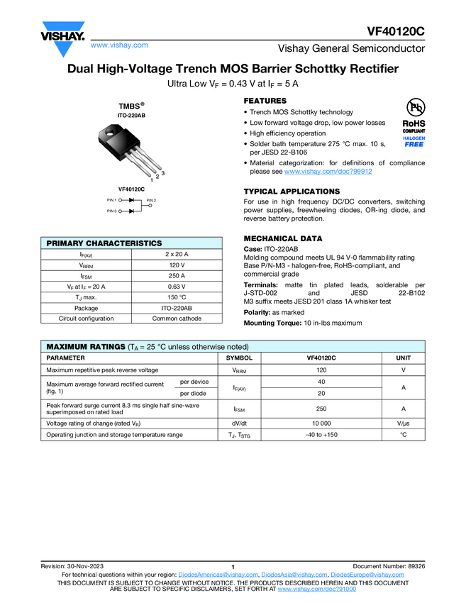 Dual High-Voltage Trench MOS Barrier Schottky Rectifier Ultra Low VF = 0.43 V at IF = 5 A