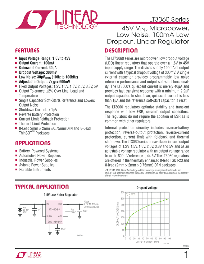 45V VIN, Micropower, Low Noise, 100mA Low Dropout, Linear Regulator
