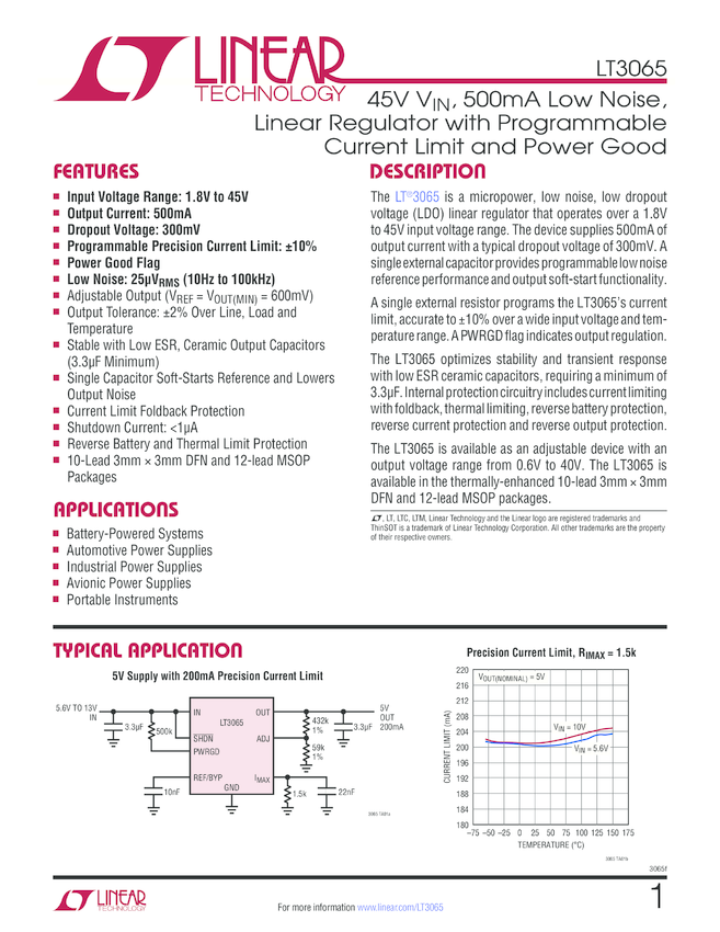 45V VIN, 500mA Low Noise, Linear Regulator with Programmable Current Limit and Power Good