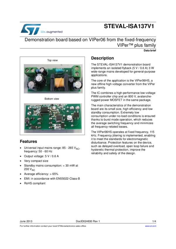 Demonstration board based on VIPer06 from the fixed-frequency VIPer™ plus family