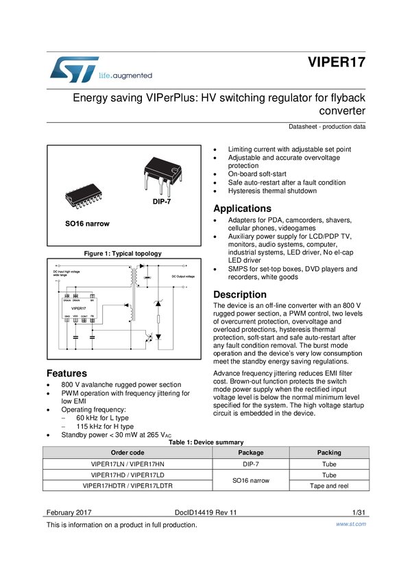 Układ scalony; przetwornica; AC-DC; PMIC; Uwej:800V; 8,5-23,5V; 9W; 1 kanał; 420mA; 60kHz; DIP7; THT; ST MICROELECTRONICS; VIPER17LN; RoHS