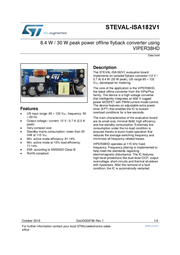 12 V, 15 W (20 W peak) isolated flyback converter based on the VIPER38LE
