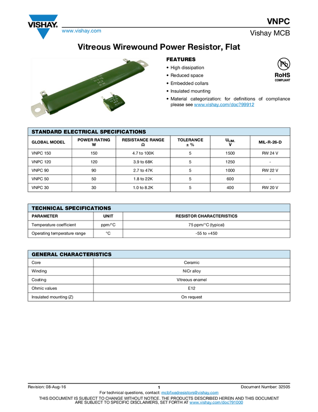 Wirewound Resistor, Industrial Power, Vitreous Coated, Miniature Flat