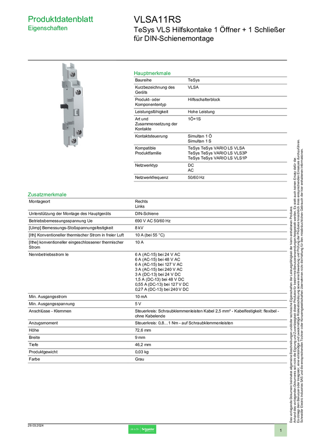 Schneider Electric VLSA11RS Przełącznik pomocniczy 1 szt.