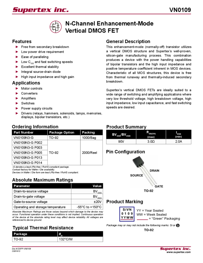 VN0109 Datasheet - N-Channel Enhancement-Mode Vertical DMOS FET (06/27/2014)