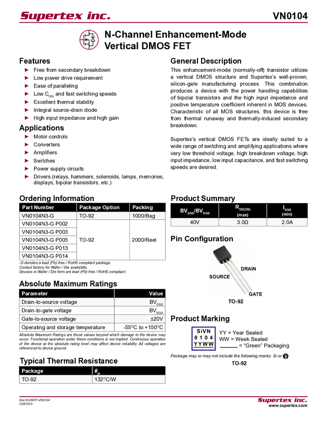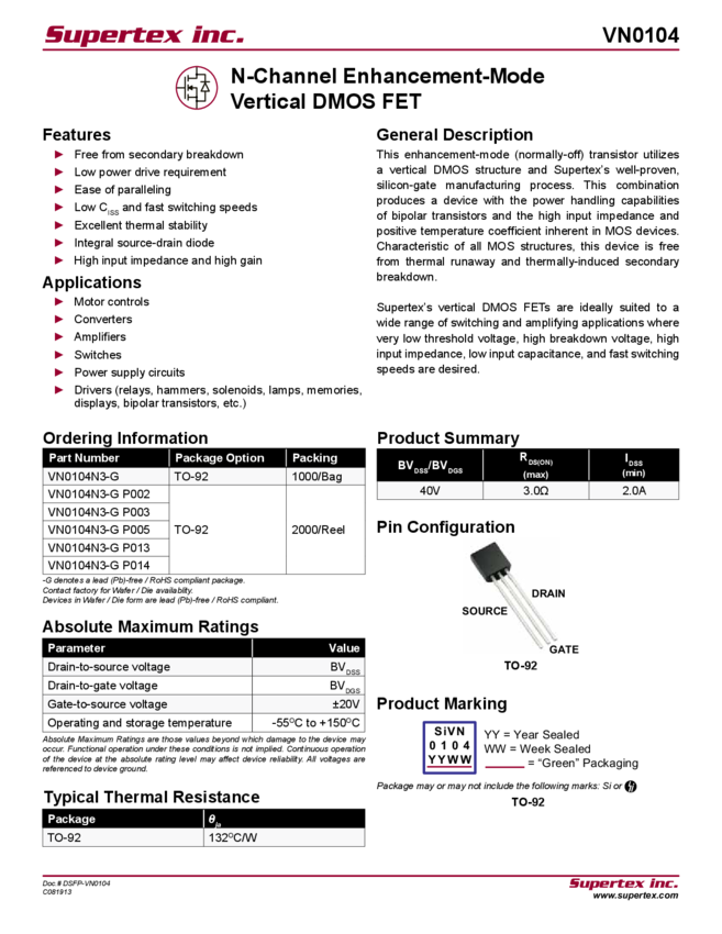 VN0104 Datasheet - N-Channel Enhancement-Mode Vertical DMOS FET (06/27/2014)