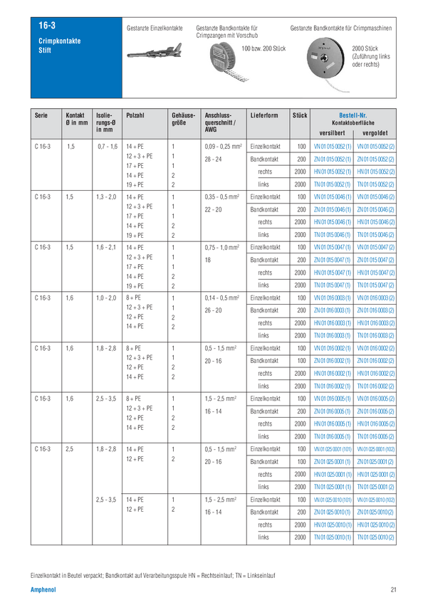Wtyk zagniatany Amphenol N01016 0004 1, 0.5-1.5 mm2, pasuje do serii C16-3/C16-3, 1-pin