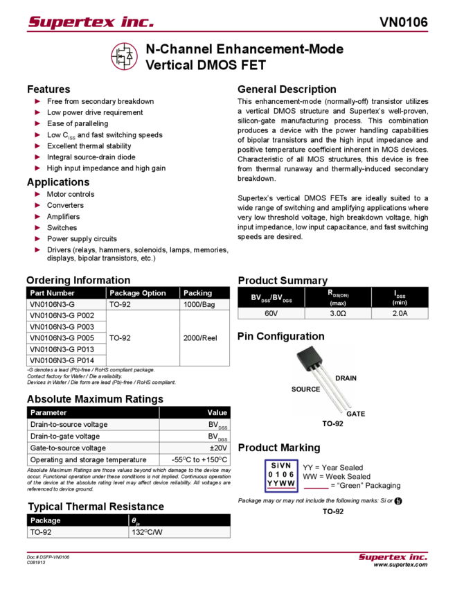 VN0106 Datasheet - N-Channel Enhancement-Mode Vertical DMOS FET (06/27/2014)