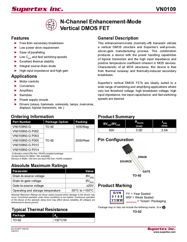 VN0109 Datasheet - N-Channel Enhancement-Mode Vertical DMOS FET
