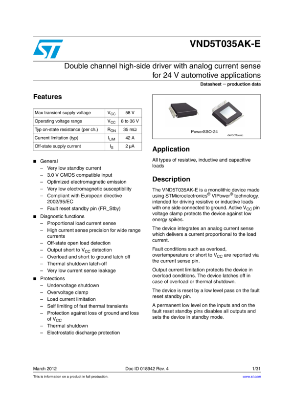 Double Channel High Side Driver with Analog Current Sense for 24V Automotive Applications