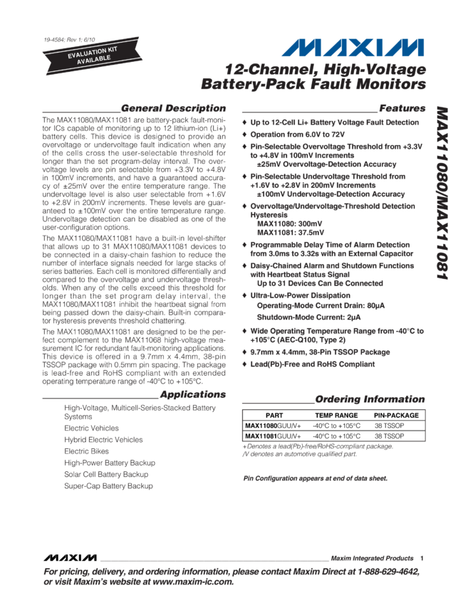 MAX11080, MAX11081 12-Channel, High-Voltage Battery-Pack Fault Monitors