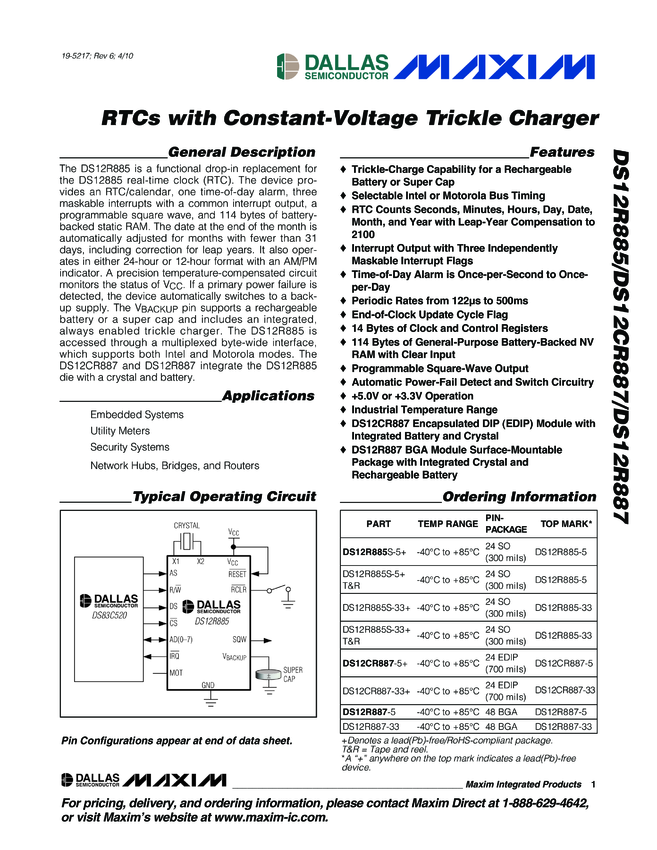 DS12CR887, DS12R885, DS12R887 RTCs with Constant-Voltage Trickle Charger