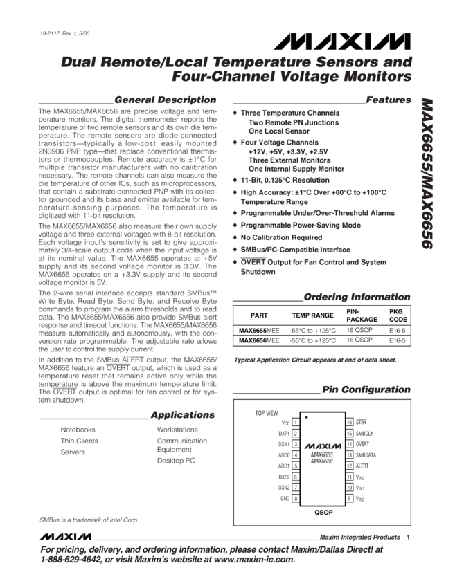 MAX6655, MAX6656 Dual Remote/Local Temperature Sensors and Four-Channel Voltage Monitors