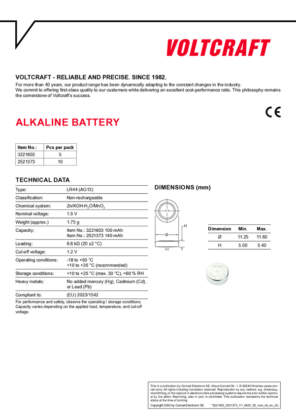 VOLTCRAFT LR 44 Ogniwo guzikowe 1.5 V 100 mAh alkaliczno-manganowe VC-16108015 5 szt.