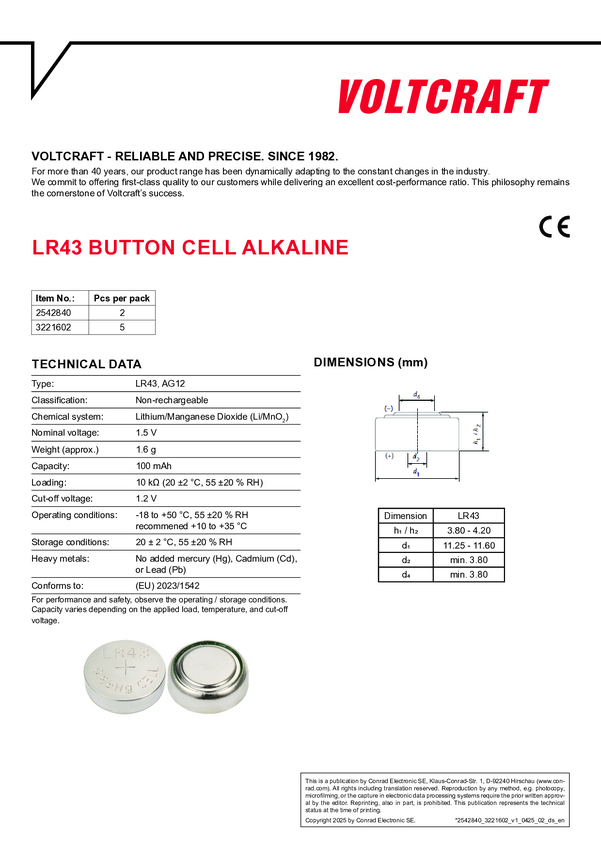 VOLTCRAFT LR 41 Ogniwo guzikowe 1.5 V 35 mAh alkaliczno-manganowe VC-16108020 5 szt.