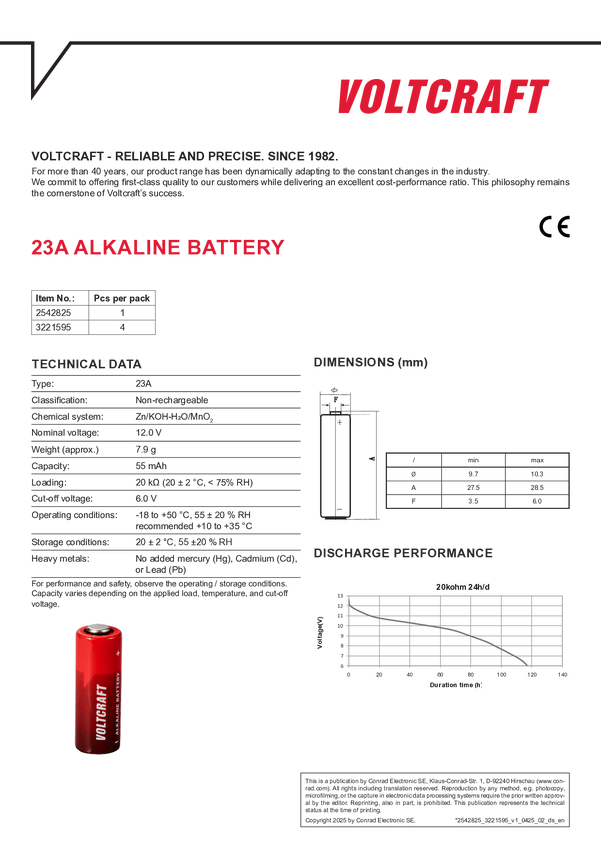 Bateria 23 A VOLTCRAFT, 12 V, 50 mAh, alkaliczno-manganowe, Guzik na górze, 4 szt.