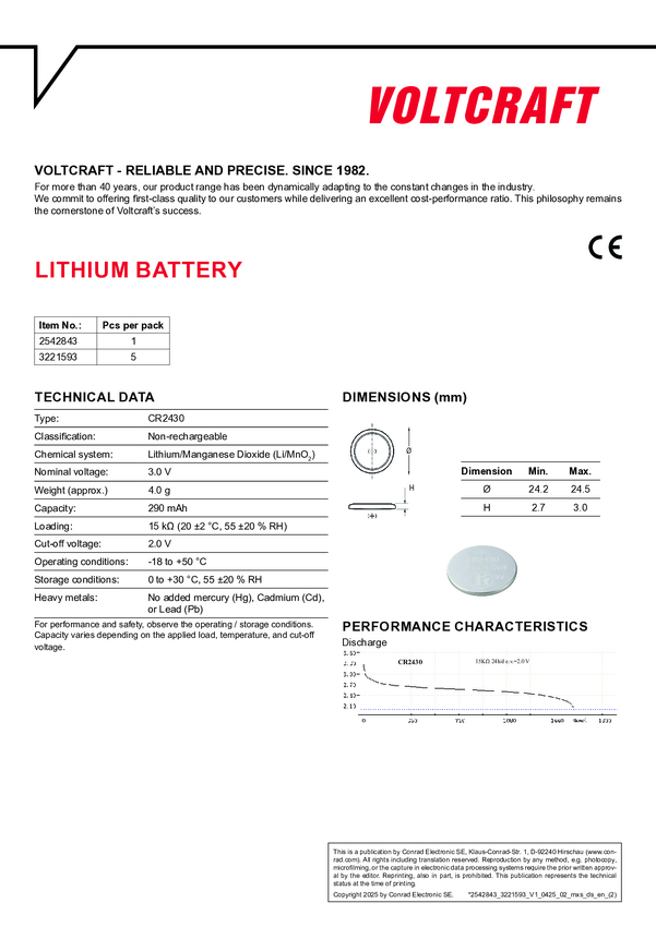 VOLTCRAFT CR 2430 Ogniwo guzikowe 3 V 290 mAh litowe VC-16107965 5 szt.