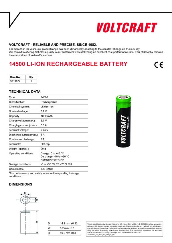 Akumulator specjalny VOLTCRAFT VC-16569885, litowe, 1000 mAh, 3.7 V, 1 szt.