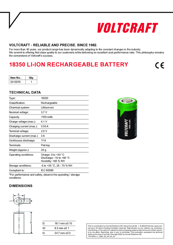 Akumulator specjalny VOLTCRAFT VC-16569880, litowe, 1100 mAh, 3.7 V, 1 szt.