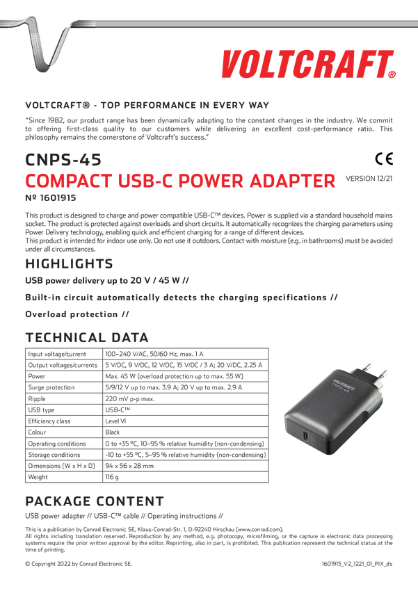 Ładowarka USB VOLTCRAFT 3 A 45 W USB Power Delivery (USB-PD)